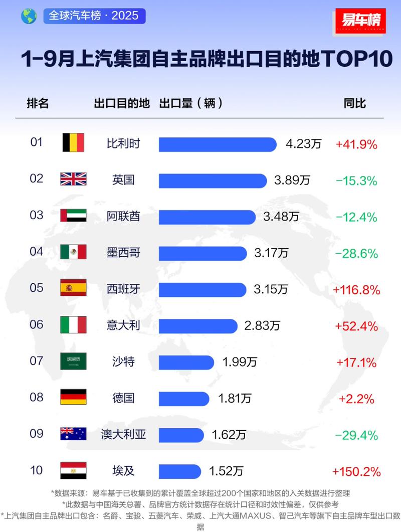 1-9月上汽集团出口目的地前3名国家分别为:比利时、英国、阿联酋。西班牙和埃及市场同比增幅最为明显,分别为116.8%和150.2%。