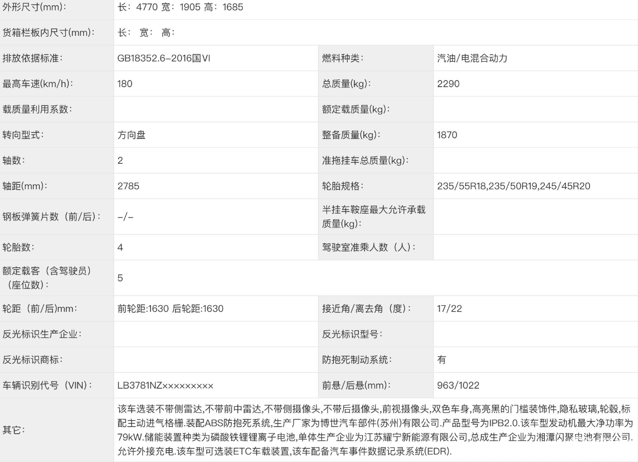 配备磷酸铁锂电池,18.4度电和29.8度电两种容量,WLTC工况下,纯电续航里程101km、155km,相比银河L7有所增加,馈电油耗分别为4.69L、4.73L,全系都符合今年的5%购置税减免政策。