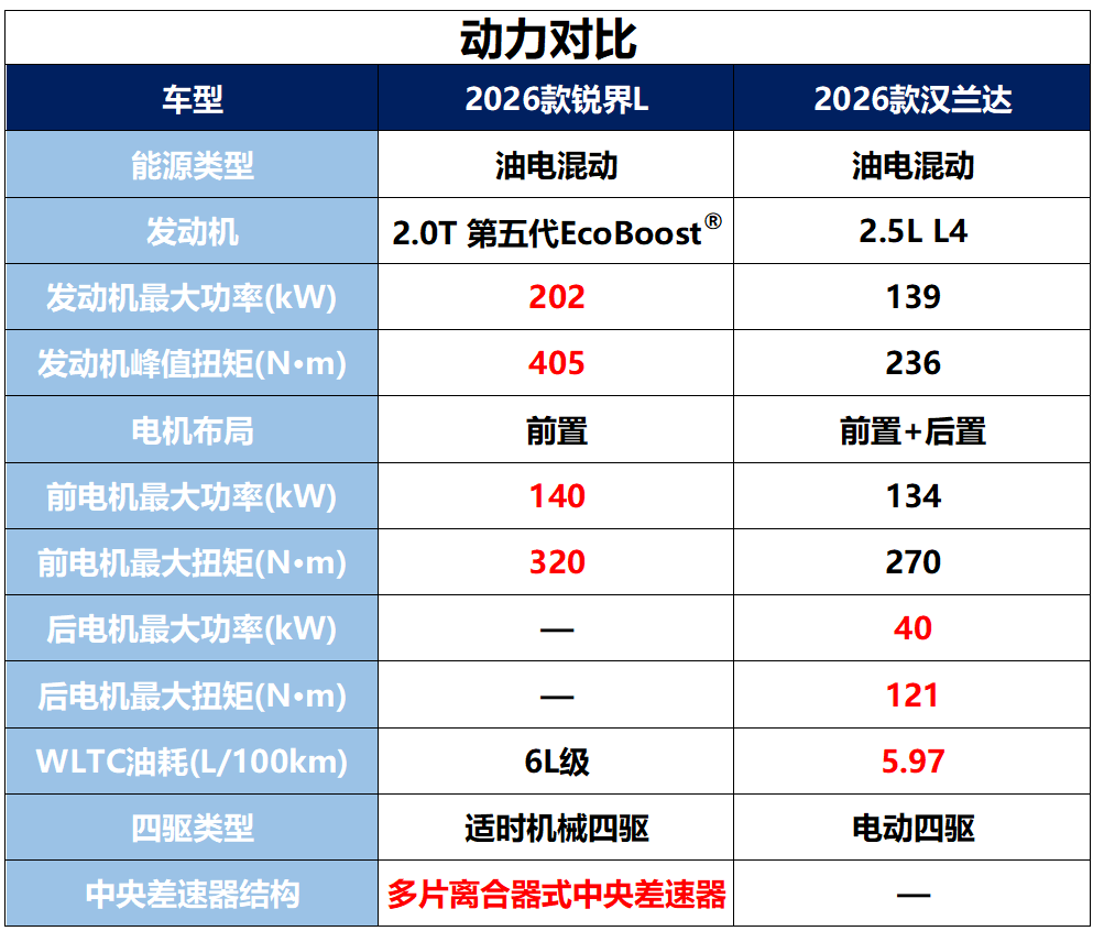 在动力系统上,锐界L和汉兰达这两款车走上了不同的技术路线。2026款锐界L搭载2.0T 第五代EcoBoost®发动机+电机的组合,发动机最大功率202kW,扭矩405N·m,电机140kW,百公里加速轻松进7秒级。2026款汉兰达则搭载2.5L自然吸气发动机+混动系统,发动机最大功率139kW,236 N·m,电机174kW,从动力数据来看,2026款锐界L的动力更强,提速更快,驾驶体验感也会更好。2026款锐界L和2026款汉兰达这两款车的顶配版都配有四驱系统,但采用的四驱形式完全不同。2026款锐界L采用机械式适时四驱,后轮动力直接来源于发动机,动力传输更直接、可靠性更高。而2026款汉兰达采用的是电动四驱,后轮由40kW的电动机驱动,动力输出较弱,更多是“提升日常行驶的稳定性”。