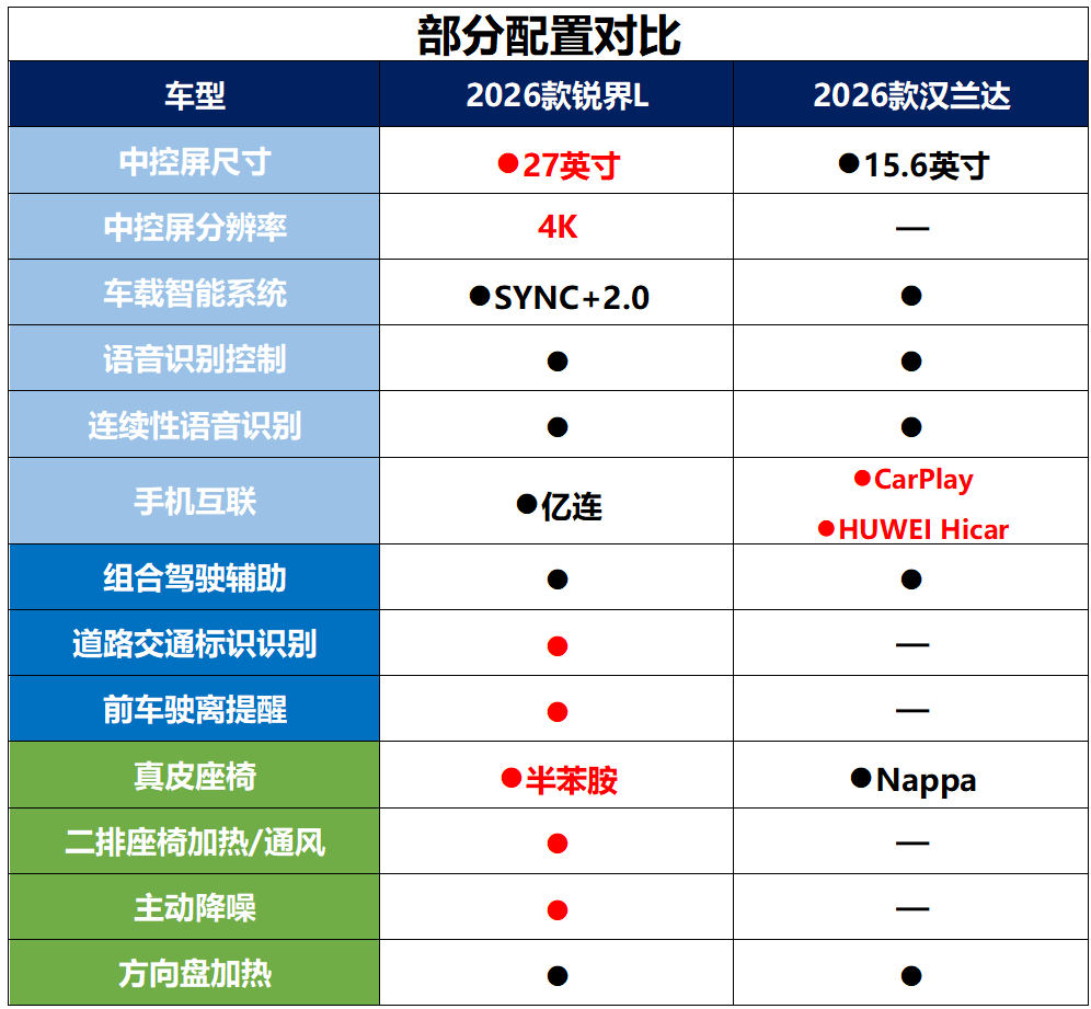 9月下旬, 2026款锐界L正式上市,价格22.98-30.98万,同样是9月下旬,2026款汉兰达也正式上市,价格24.98-32.58万,从价格看,2026款汉兰达的价格区间要比2026款锐界L高出2万元左右。为了公平起见,我们今天都选取各自的顶配版车型进行对比,2026款锐界 L 2.0T EcoBoost® E混动四驱七座旗舰型和2026款汉兰达双擎 2.5L 四驱至尊版 7座(下文分别简称:2026款锐界L、2026款汉兰达)。